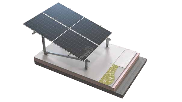 A solução do sistema de telhado fotovoltaico de concreto é feito sob medida para os telhados de construção de concreto. Os adesivos especiais são usados para aderir completamente às membranas impermeáveis PVC/TPO de Canlon à camada de proteção de concreto. A força adesiva é usada para resistir a cargas de vento. As membranas são soldadas por ar quente para formar uma camada impermeável completa e o sistema de telhado é composto de estruturas relacionadas, como a camada de isolamento. O sistema é fácil de construir, não requer derretimento a quente e também pode ser instalado com suportes, combinando impermeabilização com geração de energia fotovoltaica para formar um sistema de telhado funcional.