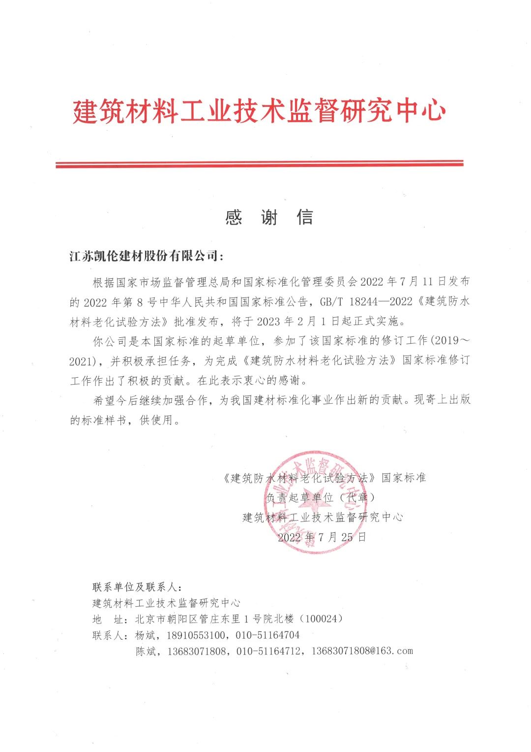 Recentemente, o padrão nacional 'Método de teste de envelhecimento para construção de materiais à prova d'água' coeditado por Canlon foi lançado oficialmente.Como uma das unidades de redação, Canlon participou da revisão da norma nacional e recebeu uma Carta de Agradecimento do Centro de Supervisão Técnica e Pesquisa para Construção Indústria de Materiais.