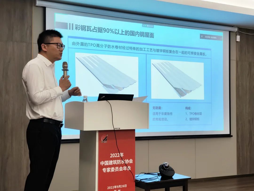 Shan Yongsheng, Diretor do Centro de P&D Canlon, compartilhou o tema 'Prática de P&D e Engenharia de Chapas Metálicas Compostas de Membrana TPO' e apresentou o processo de P&D e o processo de inspeção do sistema de painel integrado TMP da Canlon, bem como a construção plano e tratamento detalhado do sistema.