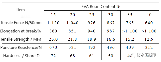 Utiliza HDPE como resina principal e é modificado com adição de resina EVA. O efeito do teor de resina EVA nas propriedades mecânicas e resistência à perfuração da folha (espessura 1,0 mm) foi investigado. Os resultados são mostrados na Tabela 1.