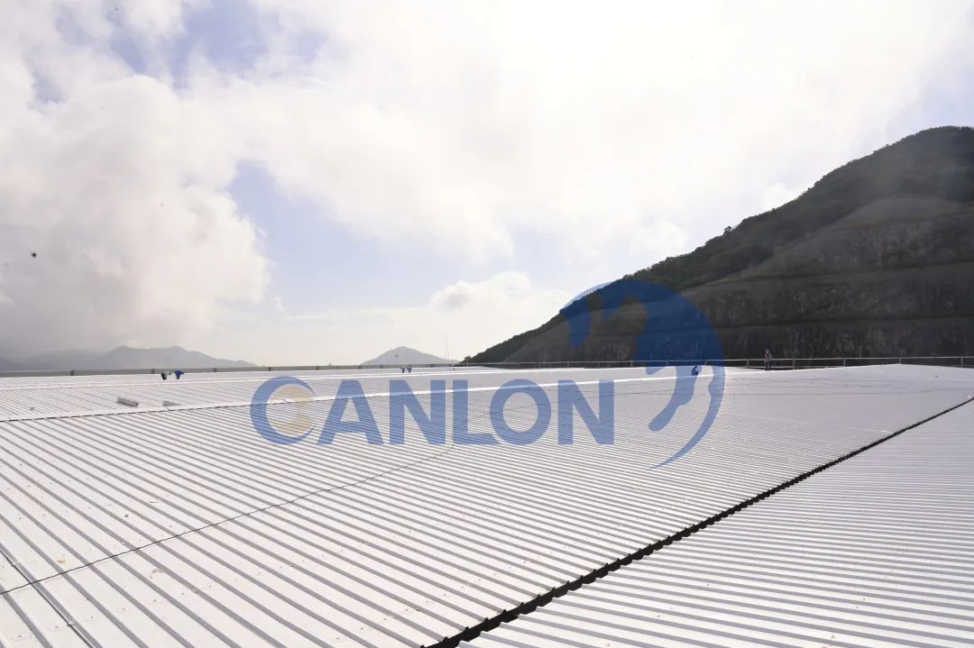 Como área costeira, Zhoushan é o ponto de chegada de muitos tufões de grande escala;ao mesmo tempo, o valor médio do pH da precipitação anual é de 4,91, e muitas vezes há poluição por chuva ácida, o que impõe requisitos mais elevados à resistência ao vento e ao desempenho anticorrosivo do telhado.Para proteger a cobertura dos edifícios fabris do parque industrial e preparar a instalação da energia fotovoltaica numa fase posterior, a unidade de construção escolheu o painel metálico TMP da Canlon para construir um sistema integrado de cobertura solar após cuidadosa pesquisa técnica. IDiante de grandes projetos-chave, a CANLON rapidamente organizou a equipe de construção para ir a Zhoushan, implementar meticulosamente e de forma abrangente cada ponto técnico e ponto de construção chave, e aproveitar ao máximo as múltiplas vantagens do Painel de Metal TMP em resistência ao vento e à prova d'água e desempenho anticorrosivo.