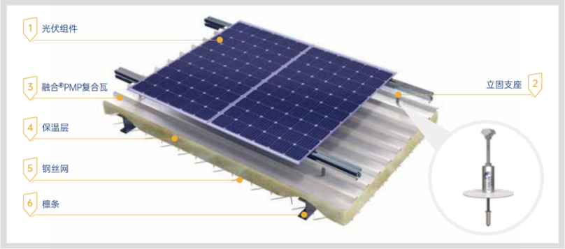 Os painéis de cobertura integrados PMP ® consistem em uma membrana impermeável de cloreto de polivinila (PVC) exposta como camada externa, que é colada a uma folha de metal por meio de uma técnica de processamento especial e depois enrolada e dobrada usando uma prensa de telha para formar um painel de cobertura moldado. Combina a instalação simples e rápida das coberturas de aço tradicionais com a resistência às intempéries e à corrosão das camadas impermeabilizantes de PVC, oferecendo uma garantia mínima de 25 anos e reduzindo eficazmente as camadas da cobertura e os custos de materiais.