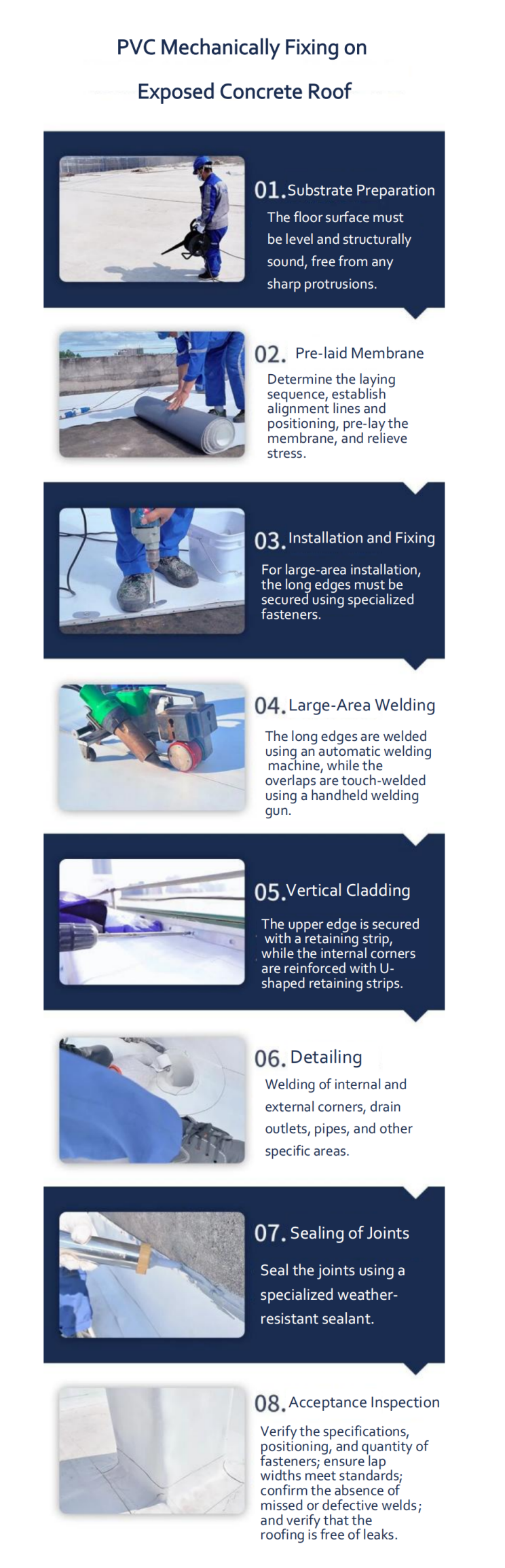 Quer se trate de impermeabilização e renovação de um telhado residencial ou de construção de impermeabilização de telhados de concreto para lojas e fábricas, a solução de fixação mecânica de PVC para telhados de concreto tornou-se uma escolha altamente popular nos últimos anos devido às suas vantagens de alta eficiência, forte estabilidade e ampla adaptabilidade entre muitas soluções de impermeabilização.